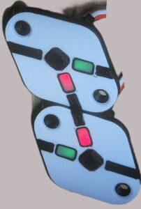 Rear view of the Front Mount Fascia Controller showing the controller board mounted on the back of a round bezel. Plenty of glue surface on the bezel. Note the Red and Green LED trace cuts for each LED.