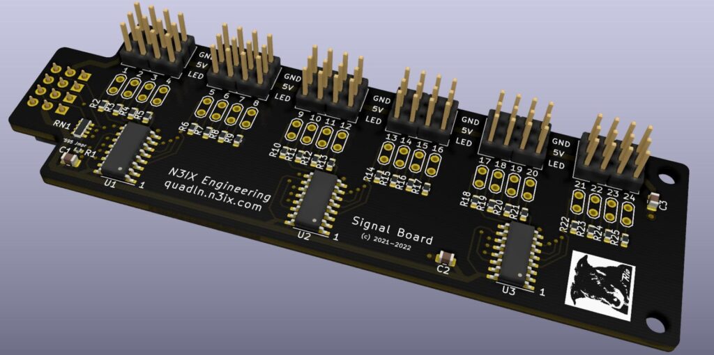 The QuadLN_S Signal Board add-on provides 24 LED outputs and realistic effects for Searchlights, CPL signals and crossings. Now includes 3D printed mounting bracket instead of standoffs for easier mounting, along with 2 screws.