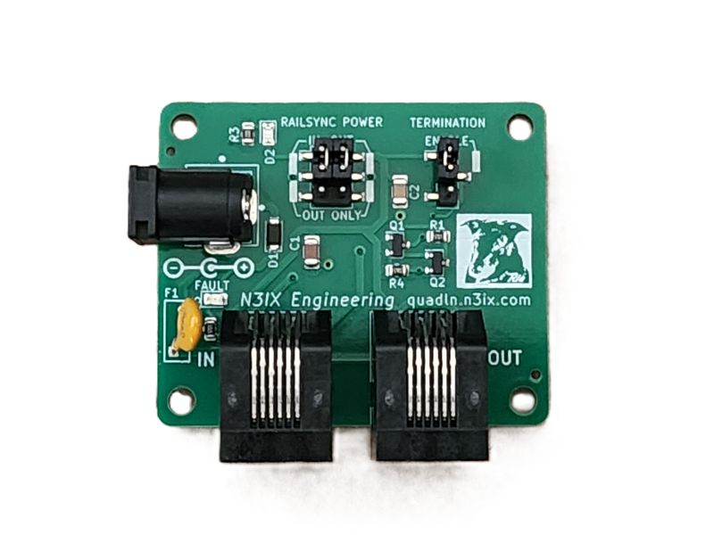 The Railsync Power and Termination Board comes with an appropriate 12VDC power supply. The Instruction Sheet describes how to configure the board for specific applications.