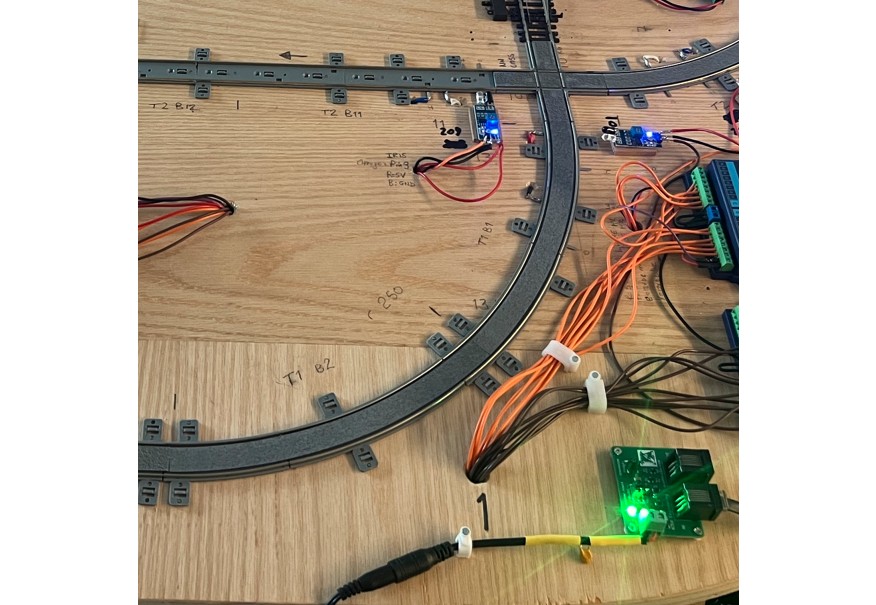 Photo shows a Railsync Power and Termination Board supporting a Standalone Loconet on Keith Louie’s layout. Keith uses a PR4 to connect the Loconet to a MacBook. JMRI and iTrain running on the MacBook process feedback from Detectors connected to Loconet stationary decoders. Keith’s layout models tram operations in the central business district of Melbourne Australia in HO. The layout is currently in the test phase and eventually will be fully automated and scenicked.